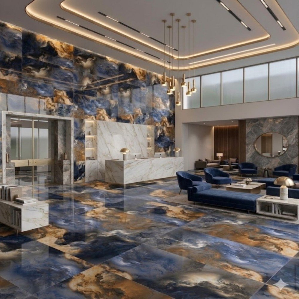 กระเบื้องพื้นลายหินอ่อน ขนาด 60x120 ซม. ผิวเงา เป็นตัวเลือกยอดนิยมสำหรับการตกแต่งบ้าน คอนโด โรงแรม ร้านค้า และโชว์รูม เพราะให้ลุคสวยหรู ดูแพง และช่วยให้พื้นที่ภายในดูกว้าง สว่าง และมีระดับมากขึ้น
