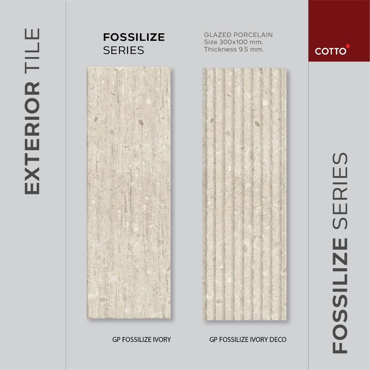 “COTTO Fossilize Ivory Deco 10x30 cm matte textured porcelain tile with fossil-stone look. Ideal for walls, outdoor areas, and pool surrounds.”